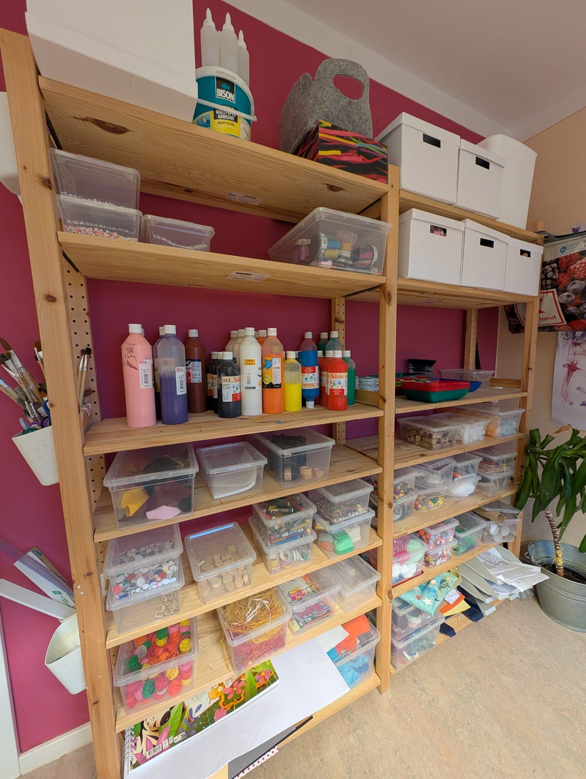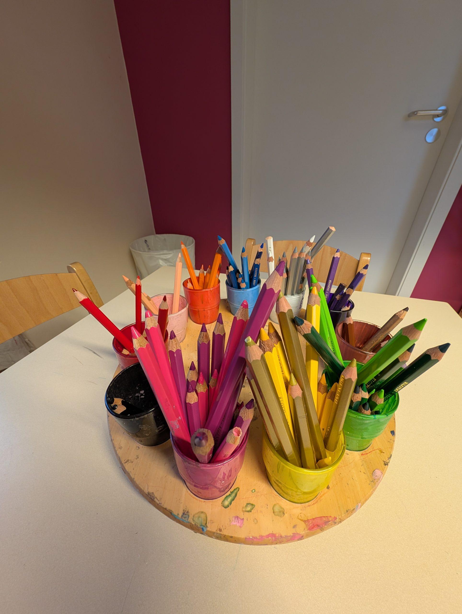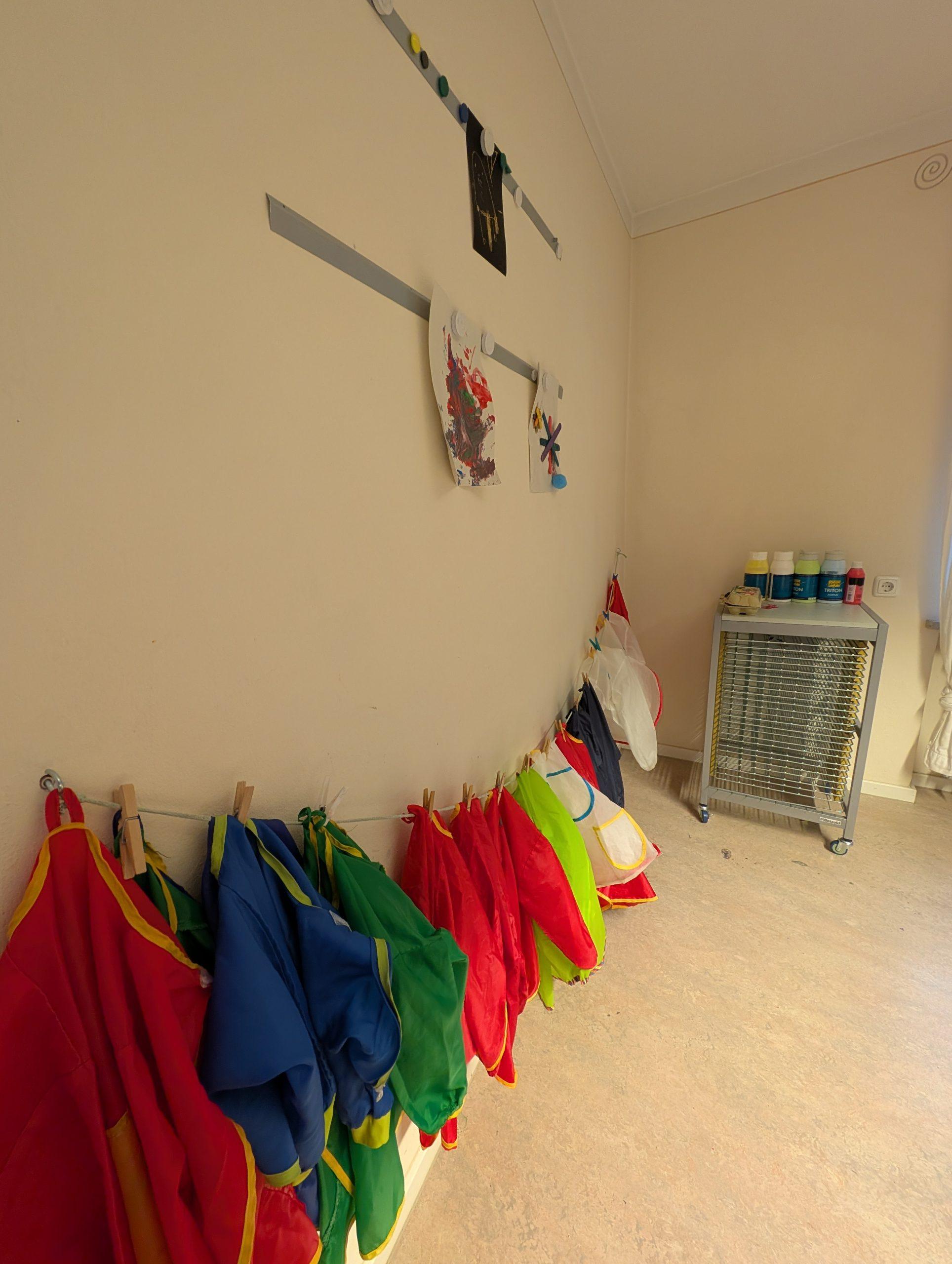 In unserem Atelier können die Kinder mit verschiedenen Materialien wie z.B. Farben, Schwämme, Korken, Zahnbürste, etc. experimentieren und sich ausprobieren. Dabei können sie ihrer Phantasie freien Lauf lassen.